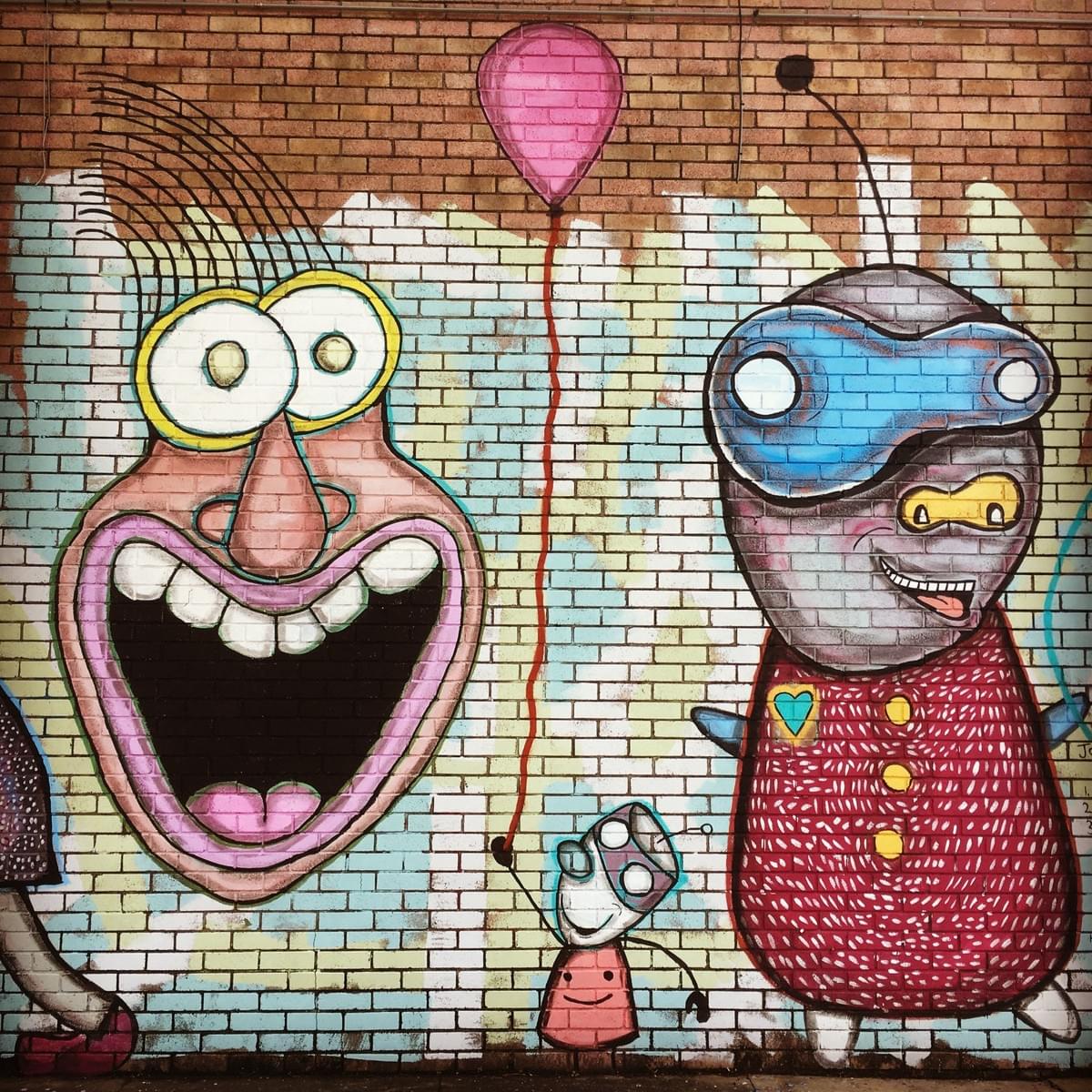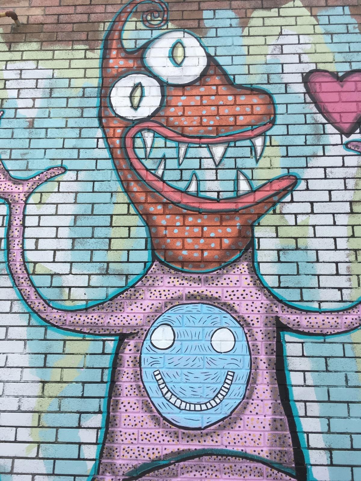 For the NOLA mural the unexpected offers of weather, painting surface, physical limitations were at first a big bummer. I cursed the fact that a recessed brick wall makes it impossible to draw a straight line. When the sudden down pour washed away the section that I had been working on for the past 2 hours I was slightly devastated. But then I remembered that I actually teach this stuff. As they say, you can’t control what happens to you, you can only control your reaction to it. I snapped out of my funk and asked “what’s the offer here?”. The untreated brick allowed me to create an unplanned background. I created new designs and figures from the streaks and smudges that the rain stoked paint created. I had to work slower and take a ton of breaks which allowed me to meet some awesome people in the neighborhood.