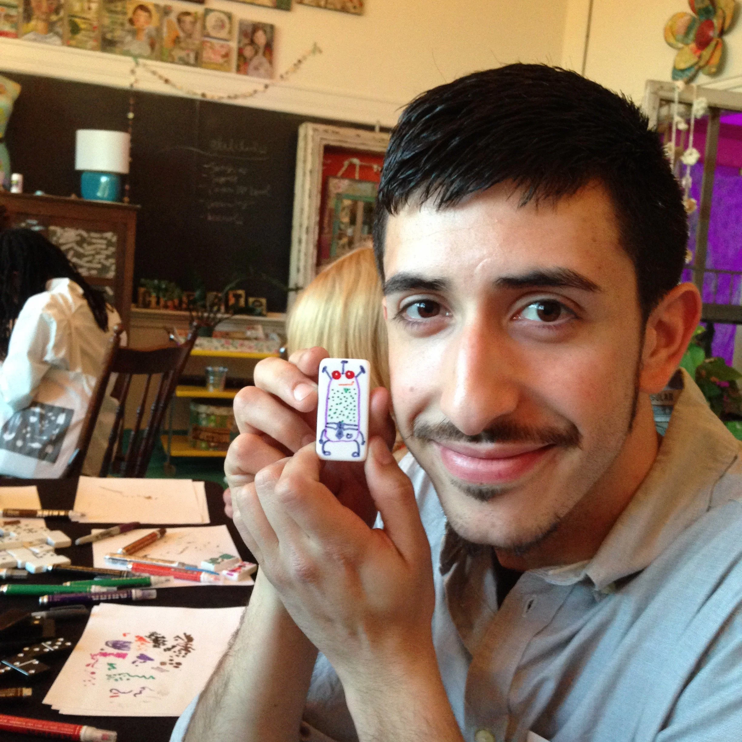 These pens can be a little frustrating when they clog and bleed. Gary constantly primes his pens by using a blank sheet of paper to constantly make marks and keep it unclogged. If the pens leaks or “blobs” out on your domino consider just using the blob and part of your robot design. Everything is an offer.